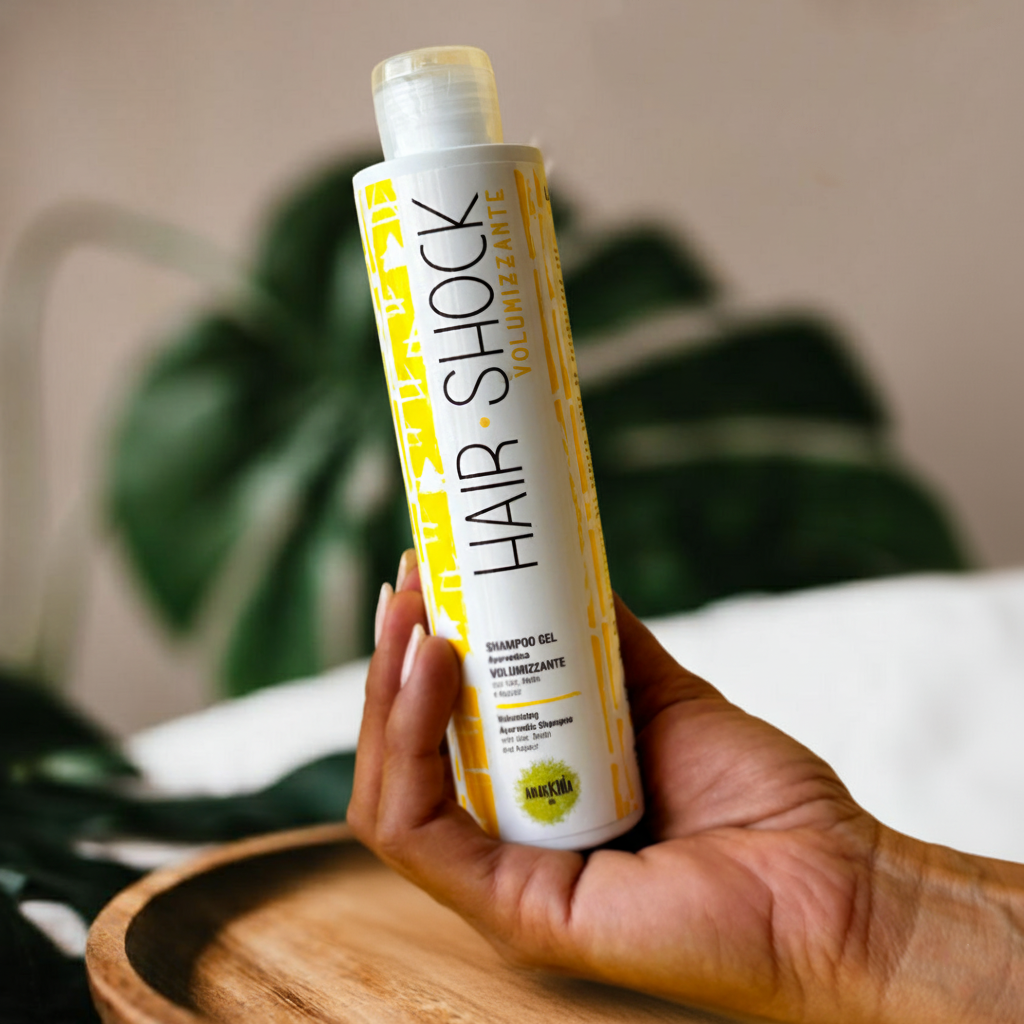 Abbiamo formulato l’Hair Shock Aria con Methi e Kapoor, due polveri ayurvediche con una forte azione condizionante che ammorbidiscono e donano volume alle lunghezze. L’ Argilla Verde garantisce il giusto apporto di minerali, che aiutano a riequilibrare efficacemente il ph favorendo l’ossigenazione cellulare, e il Sidr è una polvere ricca di saponine vegetali che aiuta a detergere la cute senza aggredirla (bilanciando il tensioattivo). Il Pantenolo idrata e protegge. L’estratto di Fico d’India è ricco di vitamine ed ha proprietà idratanti e lenitive.