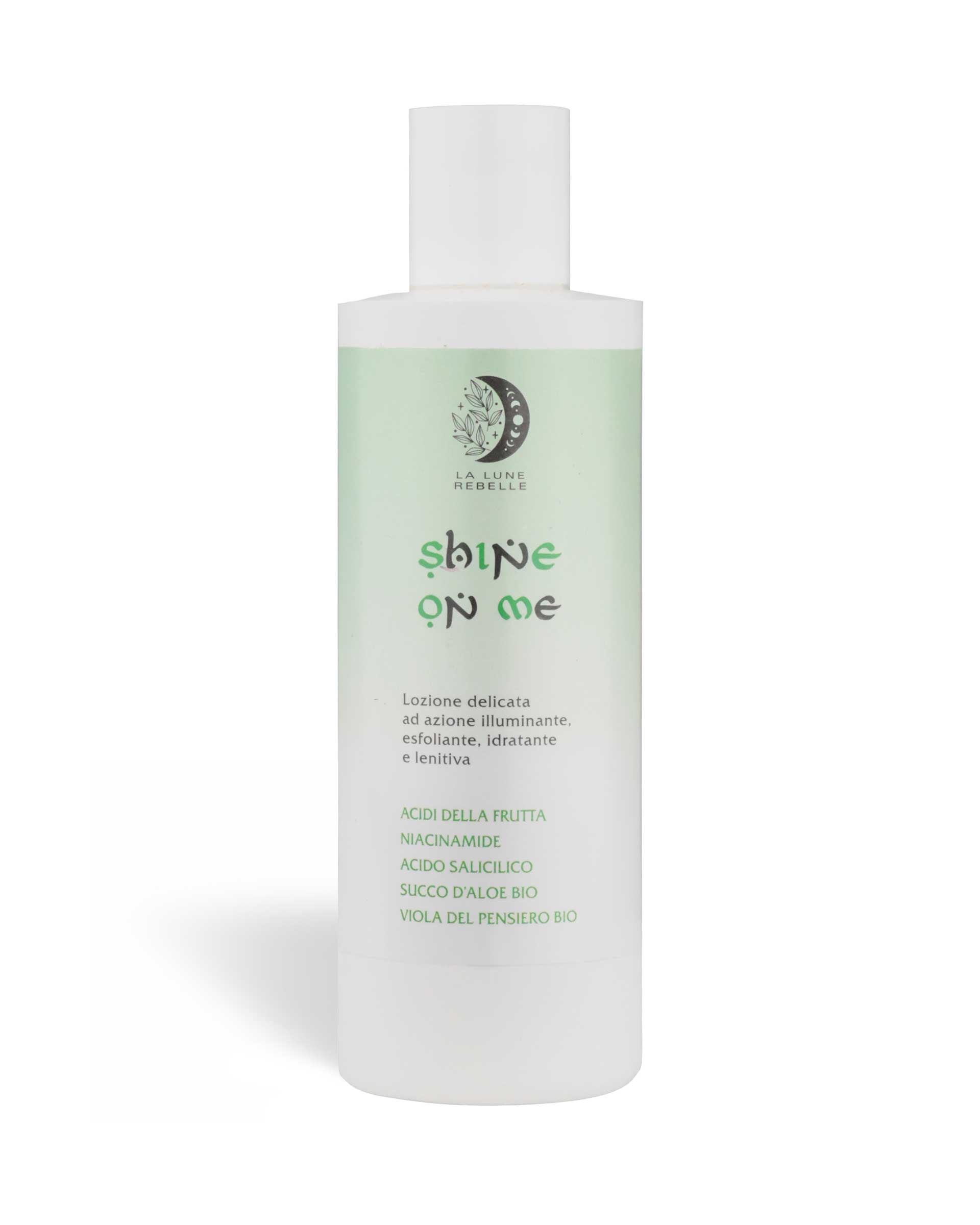 SHINE ON ME - Tonico illuminante, esfoliante, antiossidante e riequilibrante che stimola il ricambio cellulare e la produzione di collagene ed elastina. Grazie agli ingredienti purificanti, riduce l'eccesso di sebo e minimizza i pori dilatati, rendendo la pelle compatta e levigata. Perfetto per preparare la pelle all'assorbimento degli ingredienti successivi nella beauty routine.
